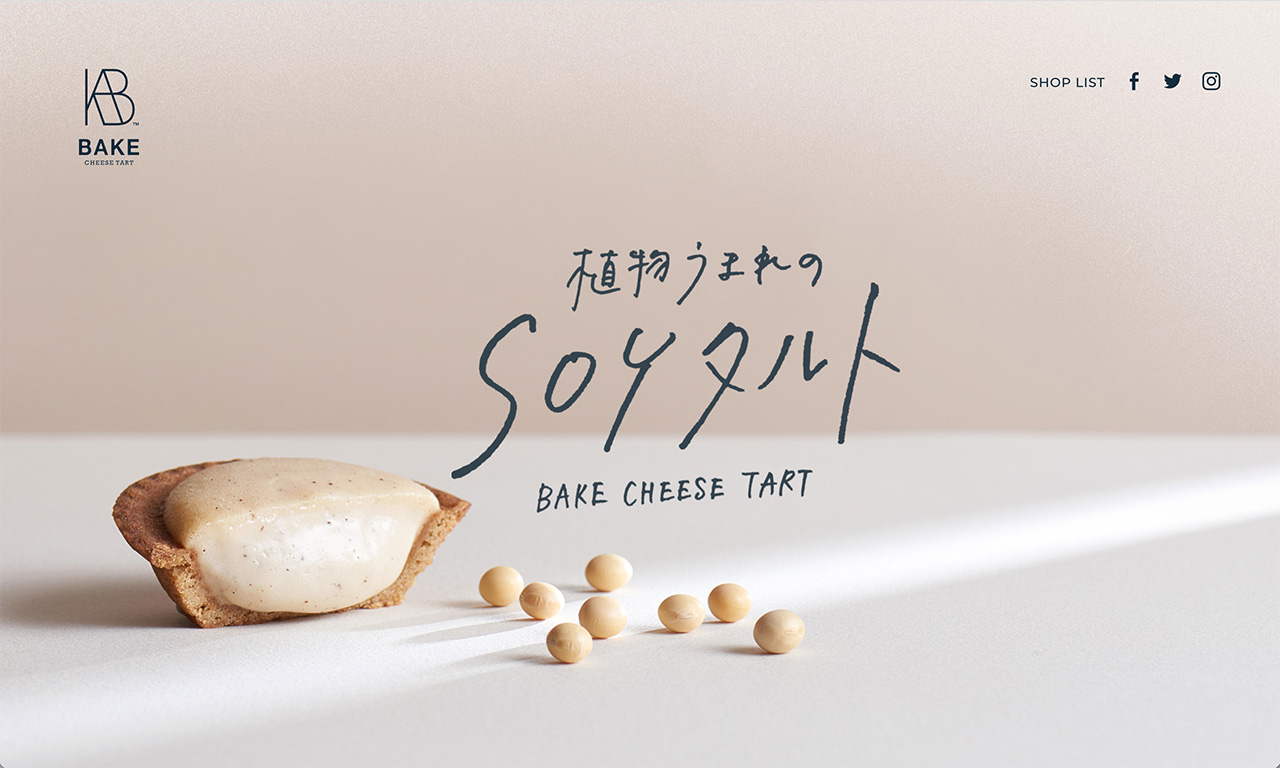 BAKEブランドから期間限定で発売される「植物うまれのSOYタルト」の特設サイト制作をお手伝いしました。自然由来の素材を使用したタルトとのことで、「ナチュラル」や「素」のコンセプトキーワードを含む「自然体」をデザインコンセプトとしました。やわらかさの中の芯であったり、淡さのなかの深みといったバランスを意識しています。また、全体的にクリームのふわっと感を表現できるようこだわりました。